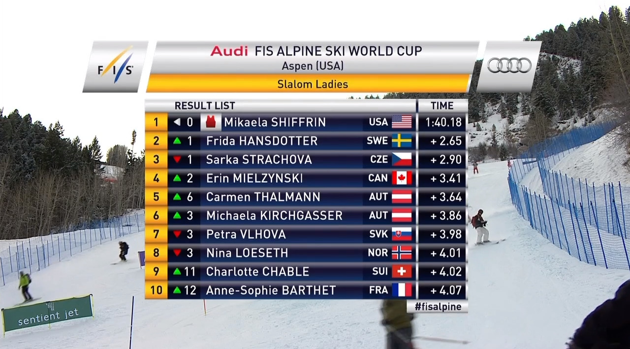 Если все-таки немного отойти от дрянного настроения и поговорить про Аспен, то нужно с удовольствием отметить еще несколько моментов. 1) В кои-то веки прилично выступила Михи Кирхгассер и Кармен Тальман с ней за компанию, точнее, наоборот. 2) Впечатляющий прорыв словачки Петры Влховой. 3) Нина Лоэзет хоть и похуже прошла вторую попытку, но прочно закрепилась в 10. 4) Самая сюрпризная барышня — это конечно швейцарка Шарлотт Шабль(Шабле?), выглядит лет так на 12,5, а заезд выдала на все 100. Чудесная барышня, есть надежда, что у швейцарок в слаломе дела наладятся. 5)Реси Штиглер в десятке вместе с Анн-Софи Барте. Американцам достаточно и Шиффрин, а я за Реси порадуюсь.