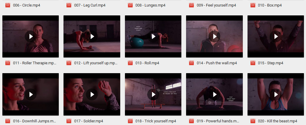 Полезно и красиво, но очень уж коротко. Секунды. Э! (Ссылку я не стану публиковать, скажу только, что названия файлов тождественны, меняется только соотв. номер). Когда все будет завершено я, кхе, опубликую эту «видеогалерею». На одном из облаков в папочке эти видяшки копятся. Дело в том, что это действительно вдохновляющие физкультурные видео.. А вдруг завтра Тина поссорится с Филой, и эту красоту изымут из эфира? Столько полезного пропадает из инета по разным причинам, так что лучше все бэкапить.