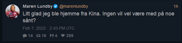 Я поначалу не врубился, думал — Марэн говорит о чем-то глобальном (типа того, что в первом абзаце этой заметки). А дело, видимо, в дисквале 4-х (sic!) сборных на микст-прыжках с трамплина? Да, Кина не будет. Слегка рада, что осталась дома и не поехала в Китай. Никто не хочет быть частью чего-то такого, правда?