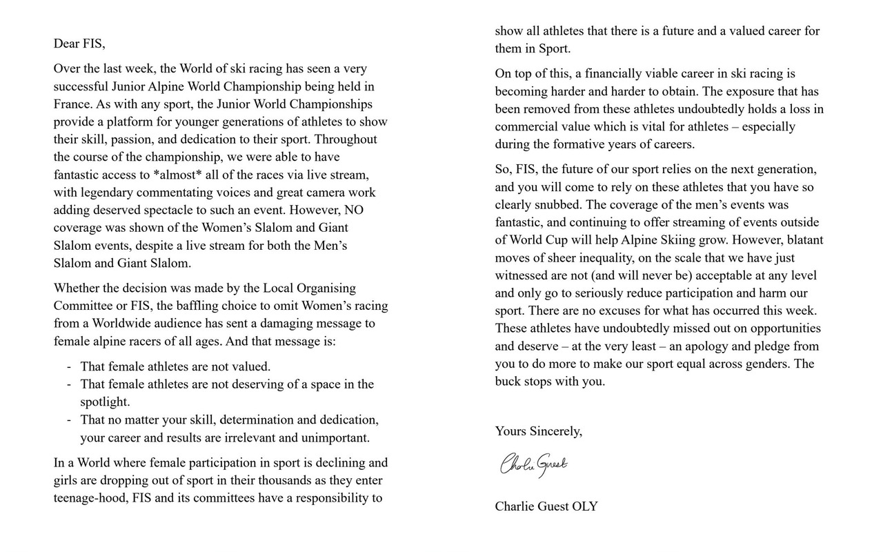 Dear? FIS?! А я напередодні ще хтів сказати, що лижний спорт, зокрема — насамперед — гірськолижний, є одним з найбільш збалансованих цих самих спортів саме за рівнями можливостей — як для хлопчиків, так і для дівчаток. А виявилось, що... ФІС пишно святкує 100-річчя своє, проте фундаментально залишається на рівні часів тієї сивомудої давнини, коли жінки ледве отримали право голосу... І то не всюди.