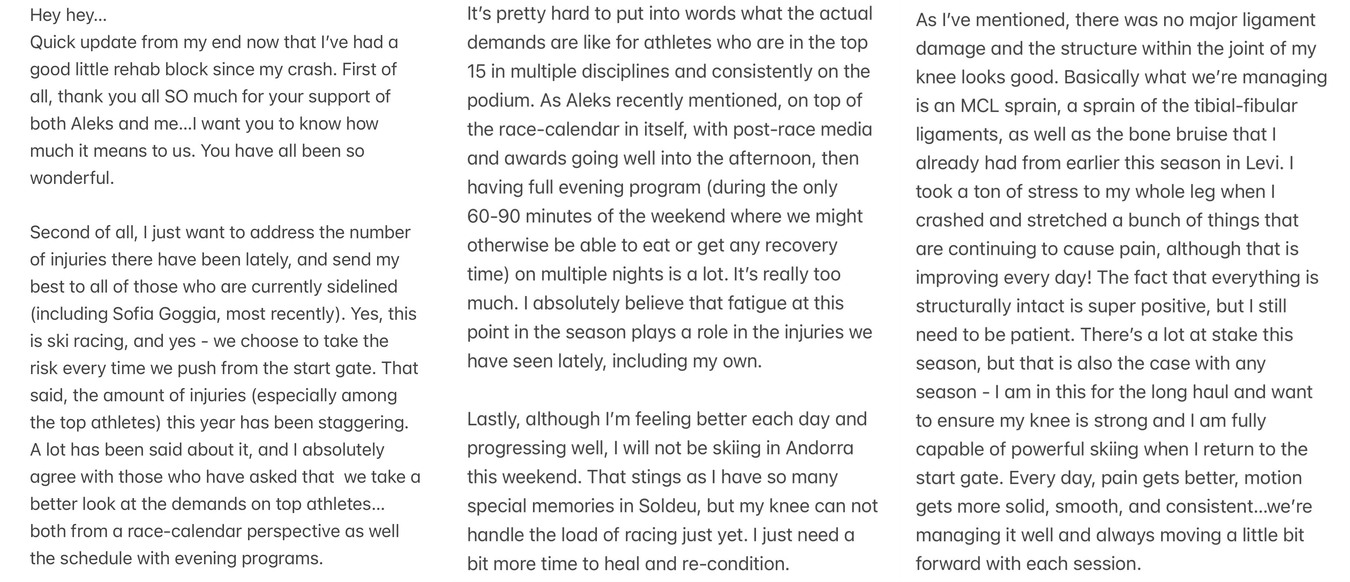 03:30, 08.02.2024 ***Власне, інформація від самої Мікаели . Без Андорри на цей раз. Що вбачається дуже розумним рішенням на далеку перспективу. [А чому Міка не припускає, що брак виступів\тренувань на довгих лижах коштував їй травми? .. Проблема, звичайно, комплексна (і перенасичений та дурно спланований календар з соусними гулянками — теж чогось відтяв корисного), я надіюсь, що, поза межами даного стейтменту, будуть зроблені більш ґрунтовні висновки.] Бажаю Мікаелі цілковитого одужання й, лише після цього, повернення. Бо приклад ЛВ, що повернулась до змагань зарано, свого часу, мабуть не дуже хороший. Навіть, якщо травма не така серйозна.