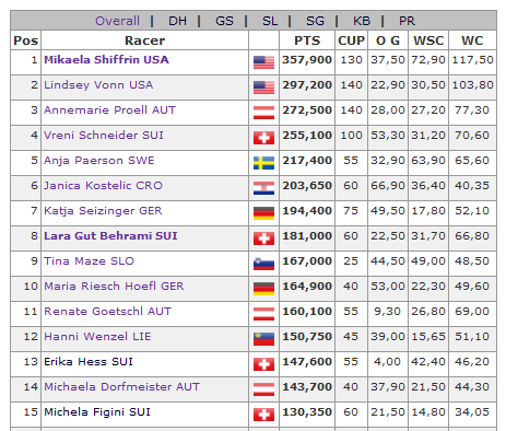 По-перше, та [можливо комусь] «цікава штучка», яку я згадував нижче. Super Ranking на ski-db.com. На даний момент (00:00 24.03) нічого ще не перераховано, але ми взнали, принаймні, чого коштують глобуси. 15 балів Великий і по 5 малі. Тобто в свій рейтинг Лара додала 25 очок. І в неї було 156 рівно (11-те місце), а, скажімо, в Тіни Мазе — 167 очок. 8-ме. Тобто... Якщо я правильно це все розумію, і нема якихось підводних, підсніжних підрахунків, ми отримаємо... Лару на 8-му місці з 181-м очком. І до Каті Зайцингер залишиться 12 очок. 12 очок — це 12 перемог на етапах кубка світу. Або 1 олімпійська золота медаль із запасом. Або рівно два срібла ОІ.. Гм. [13,400 очок, насправді, що реалістичну картину, в цілому, не міняє: перемоги, малі кубки, великі, медалі чемпіонату, усе згодиться =)].