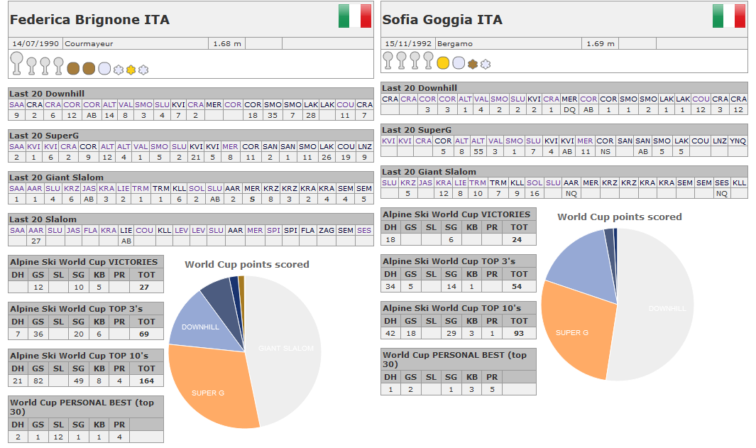 Якщо скласти спортивні досягнення обох, вийде майже одна Лара Ґут. Але окремо, перша і друга, то там, то сям чогось не добрали. Однак, в принципі, неможливо зі стовідсотковою впевненістю сказати, хто з них КРАЩА. Може зараз, після цього сезону, Федеріка стала найуспішнішою італійкою за кількістю перемог на кубкові... Але Софія — олімпійська чемпіонка. Але в неї немає великого глобуса. Але в Бриньйоне нема однорідних малих 4 шт. та статусу безшабашної суперзірки. Терези гойдаються, відчайдушно. І не дають їм врівноважитись усі, кому не ліньки. Від фанатів до самих композиторок цієї п'єси.