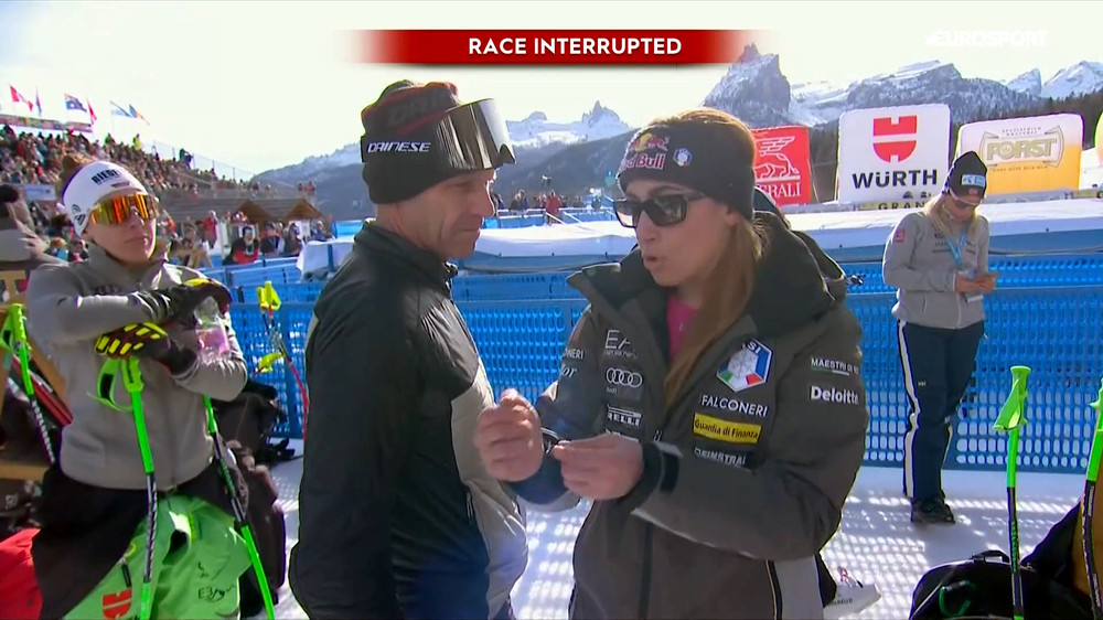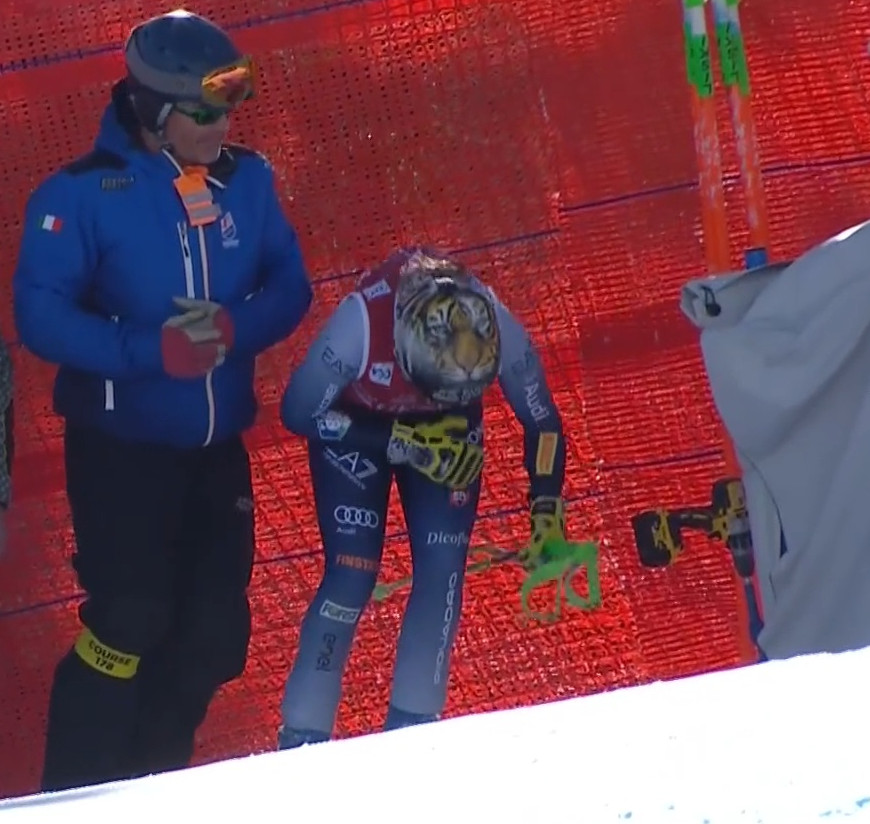 А це, здається, той самий годжиєвський громадянин з Дайнезе (може й ні, не суть). Який контраст, спокійна бесіда колег на рівних. Контекст був такий, Лара (не в імперативній манері) розповідала представникові фірми, що виготовляє «подушки безпеки», про недоліки цих виробів. Як я відмічав в попередніх дописах, у тої ж Єналь подушка спрацювала без падіння, викликавши певні проблеми з диханням, бо довбанула по грудині. .. І я помітив, що після Кортини, на наступних швидкісних етапах мало хто ці подушки став надягати, наприклад, Лора Гоше, яка постійно їх носила: ми бачили у Квітф'єлі і Заальбахові на її сумних падіннях (що підвели таки її до операції на коліні), що більше цього «засобу безпеки» у неї не є. Нуфер, Бриньйоне, Єналь відбулися певною контузією легень, внаслідок, у Кортині, це було помітно неозброєним. Потрібно доробляти.